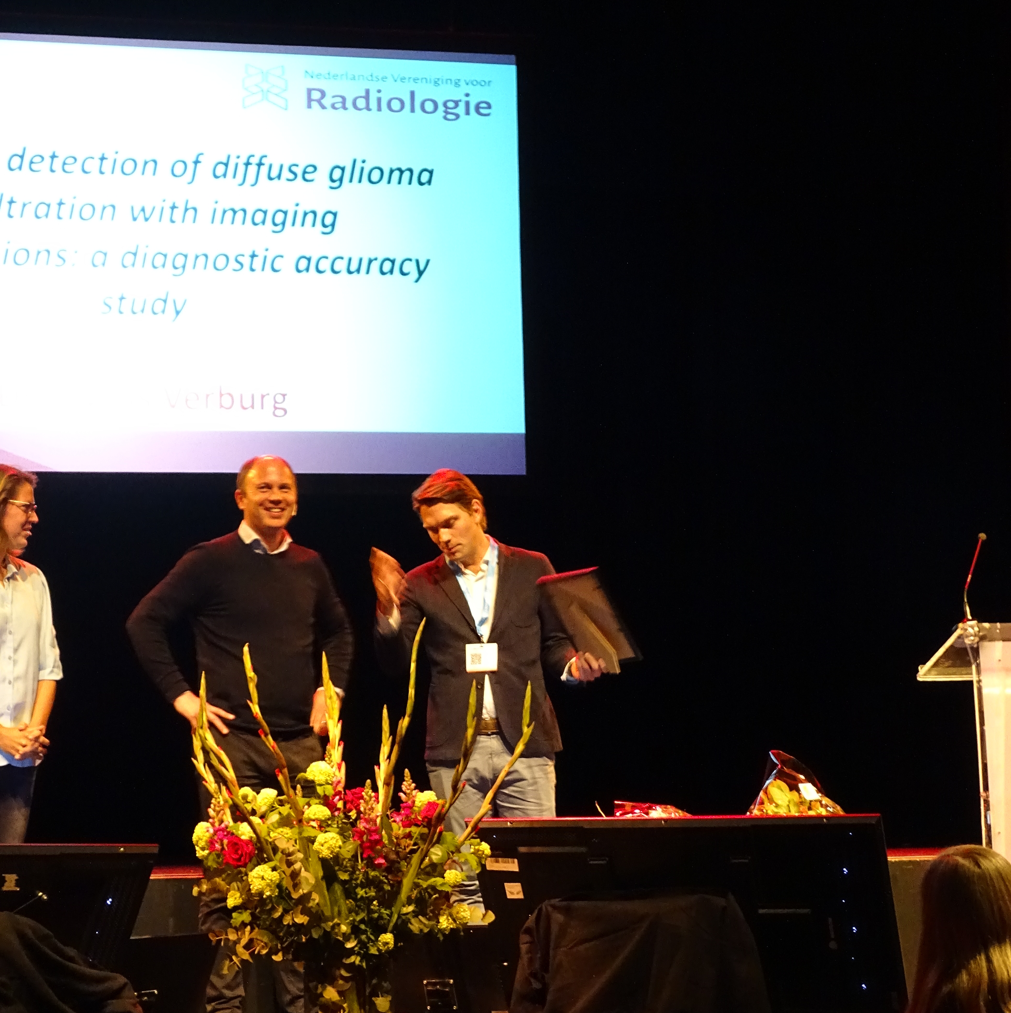 De Best Abstract prijs is aan Niels Verburg uitgereikt door twee prominente sprekers op de Radiologendagen: Teun de Nooijer en Rosanne Warmerdam voor het abstract met de titel ‘Improved detection of diffuse glioma infiltration with imaging combinations: a diagnostic accuracy study’.