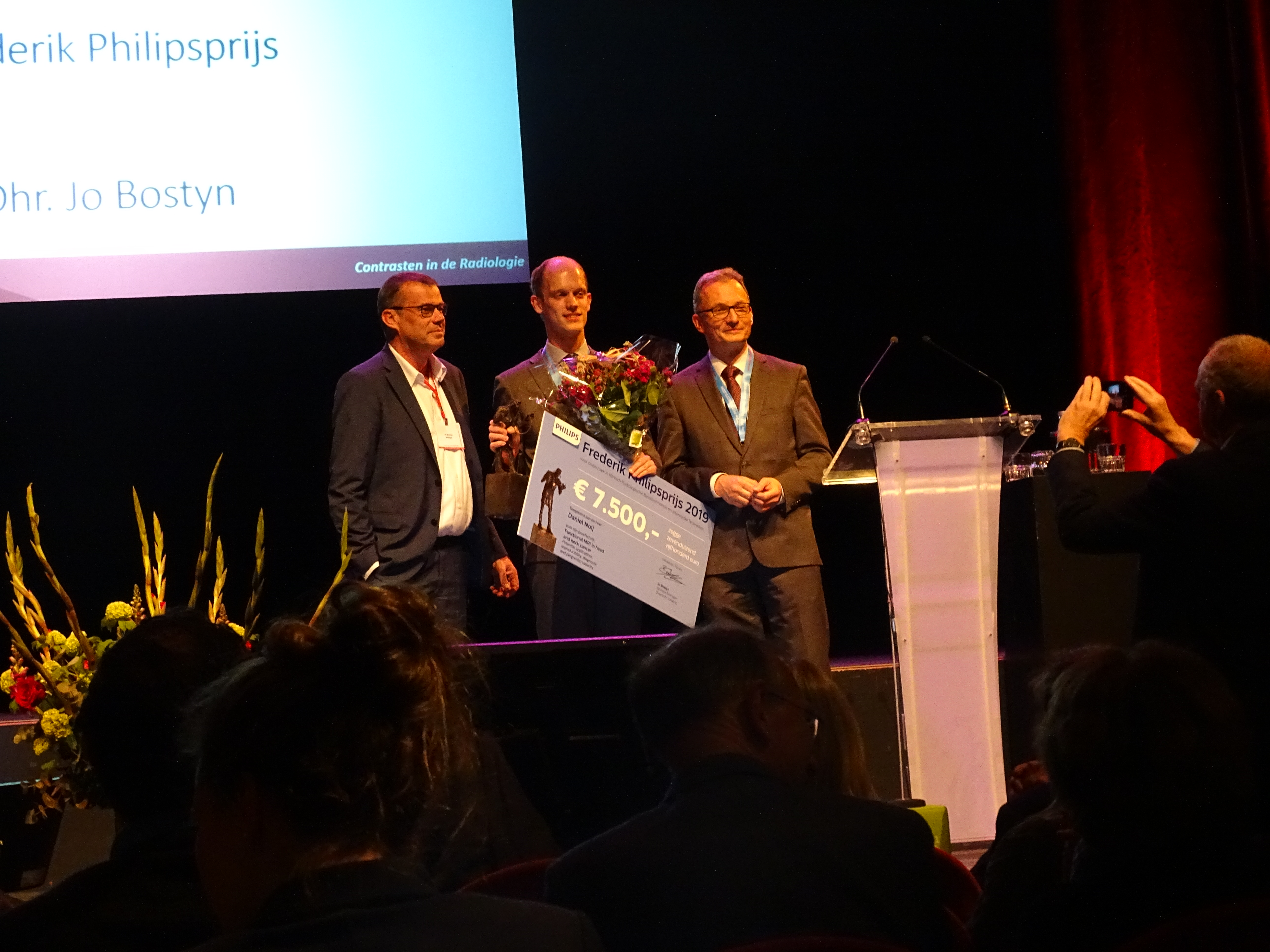 De Frederik Philipsprijs 2019 is door juryvoorzitter Mathias Prokop en Jo Bostyn namens Philips Healthcare uitgereikt aan Daniel Noij voor zijn proefschrift 'Functional MRI in head and neck cancer'.